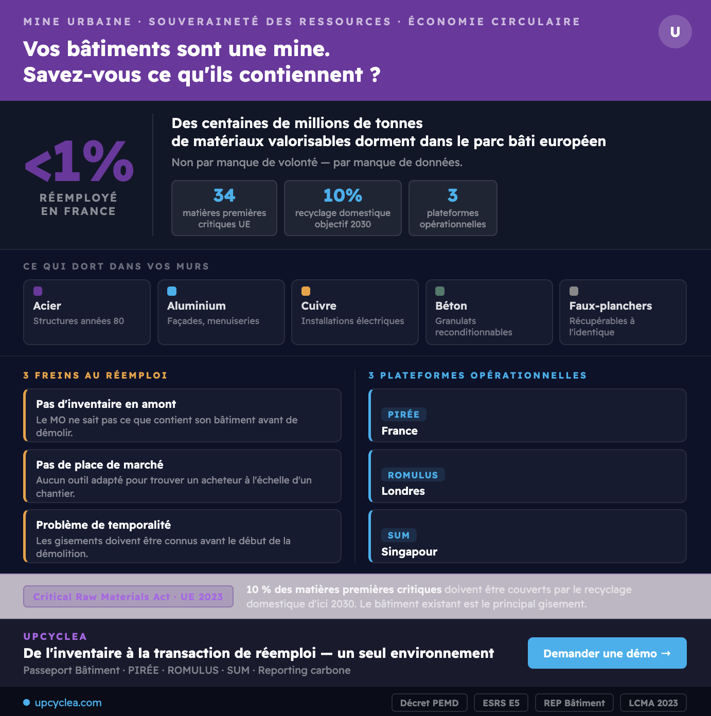 Upcyclea est le seul acteur qui connecte l’inventaire matériaux du Passeport Bâtiment aux plateformes de mine urbaine PIRÉE (en France), SUM à Singapour et ROMULUS à Londres. Du diagnostic à la transaction de réemploi, en passant par le reporting carbone : un seul environnement numérique, une seule donnée, sans ressaisie.