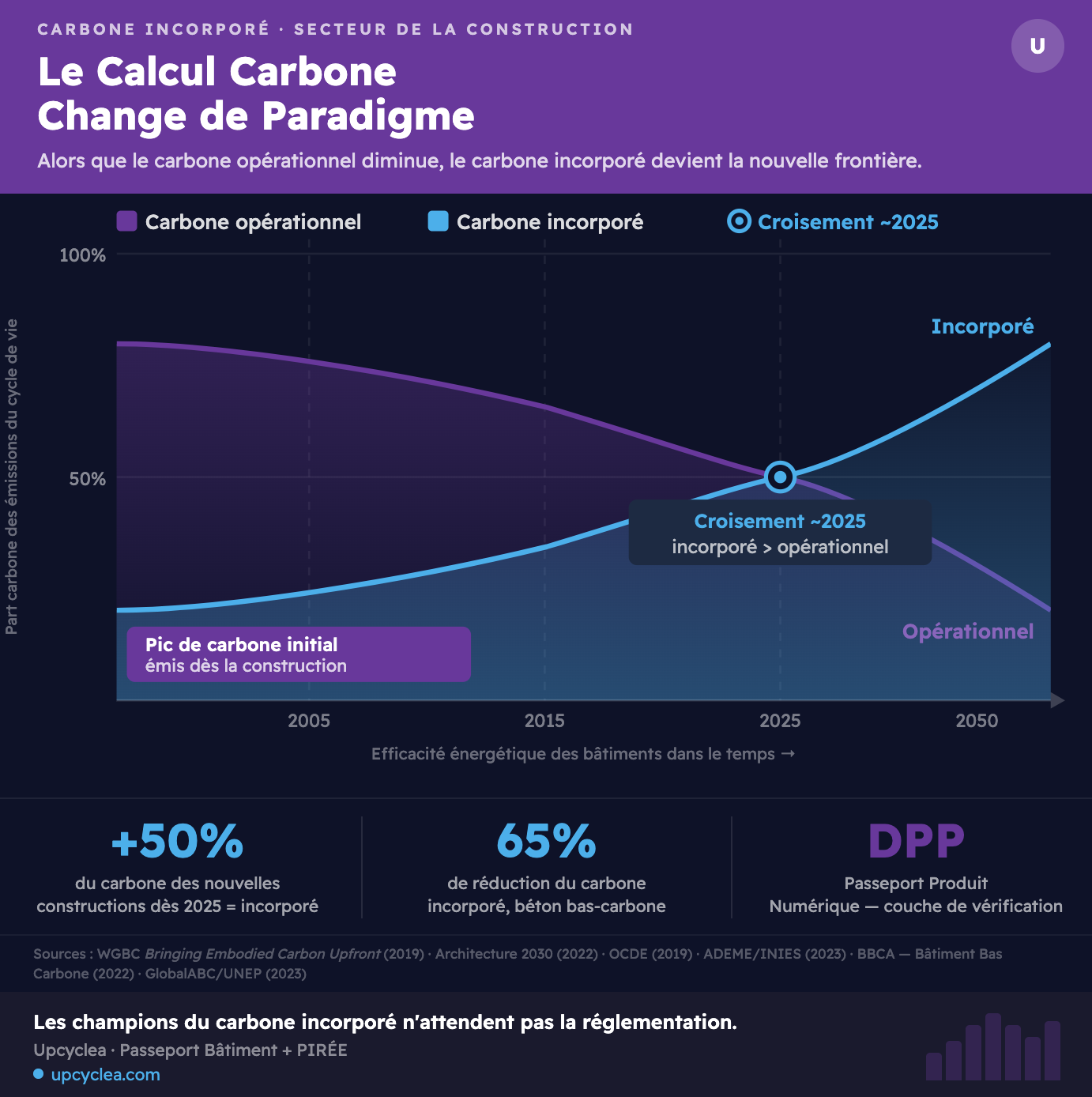 L’autre moitié, c’est le carbone incorporé, aussi appelé embodied carbon. Le carbone qui a été émis pour fabriquer les matériaux qui composent le bâtiment, pour les transporter, les assembler, et qui sera à nouveau émis quand on les démolira. Ce carbone-là ne figure dans aucune facture d’énergie. Il est invisible dans les bilans d’exploitation. Et pourtant, selon le Programme des Nations Unies pour l’Environnement, la fabrication des matériaux de construction représente à elle seule 11 % des émissions mondiales de CO₂ par an.