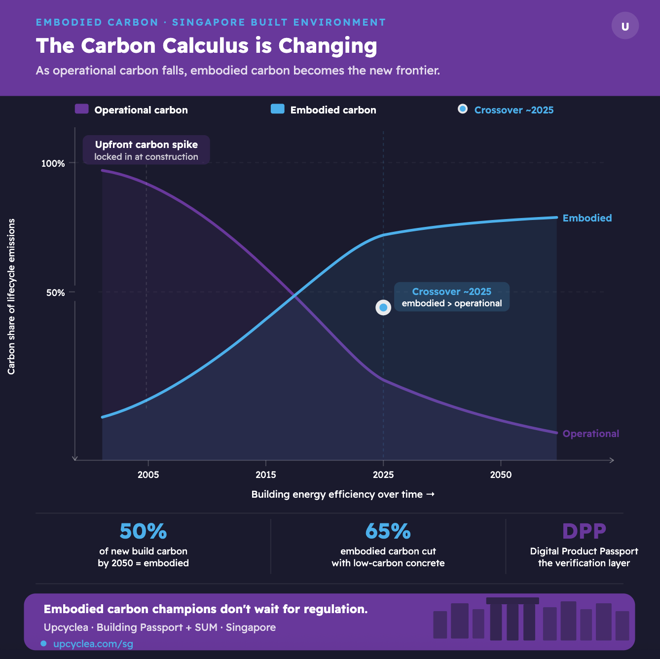 As Singapore’s buildings become more energy efficient — through better building envelopes, high-performance HVAC systems, smart energy management, and increasingly decarbonised grid electricity — the carbon emitted during a building’s operation declines. The carbon emitted during its construction does not. It was emitted when the cement was calcined, when the steel was smelted, when the aluminium was cast. It is already in the atmosphere before the building opens its doors. It cannot be offset by rooftop solar or improved chiller efficiency. It can only be avoided by choosing different materials, different structures, or different supply chains in the first place — or by recovering and reusing materials rather than producing new ones.