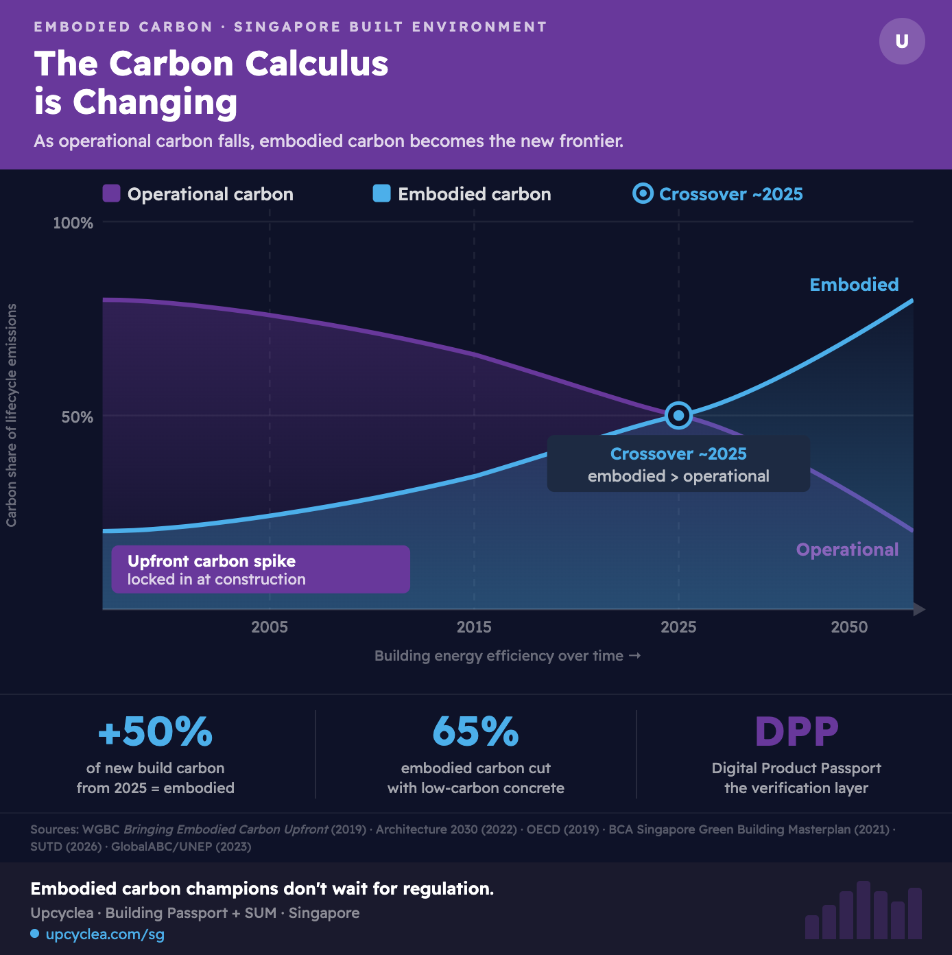 This is the reality that the 2025 Built Environment Decarbonisation Technology Roadmap confronts directly. BCA and SGBC state clearly that upfront carbon — the emissions resulting from materials production and construction before a building begins operating — has the potential to account for up to half of the entire carbon footprint of new construction between now and 2050. Singapore cannot reach its national climate targets without champions who are actively managing this number.