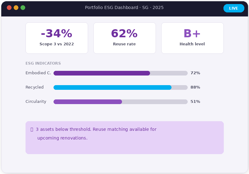 The dashboard monitors real-time material outflows, with ESG indicators derived from AI‑recommended reuse ecosystems, offering a holistic view of your portfolio’s outgoing flows and their environmental, financial, and ecosystem performance.
