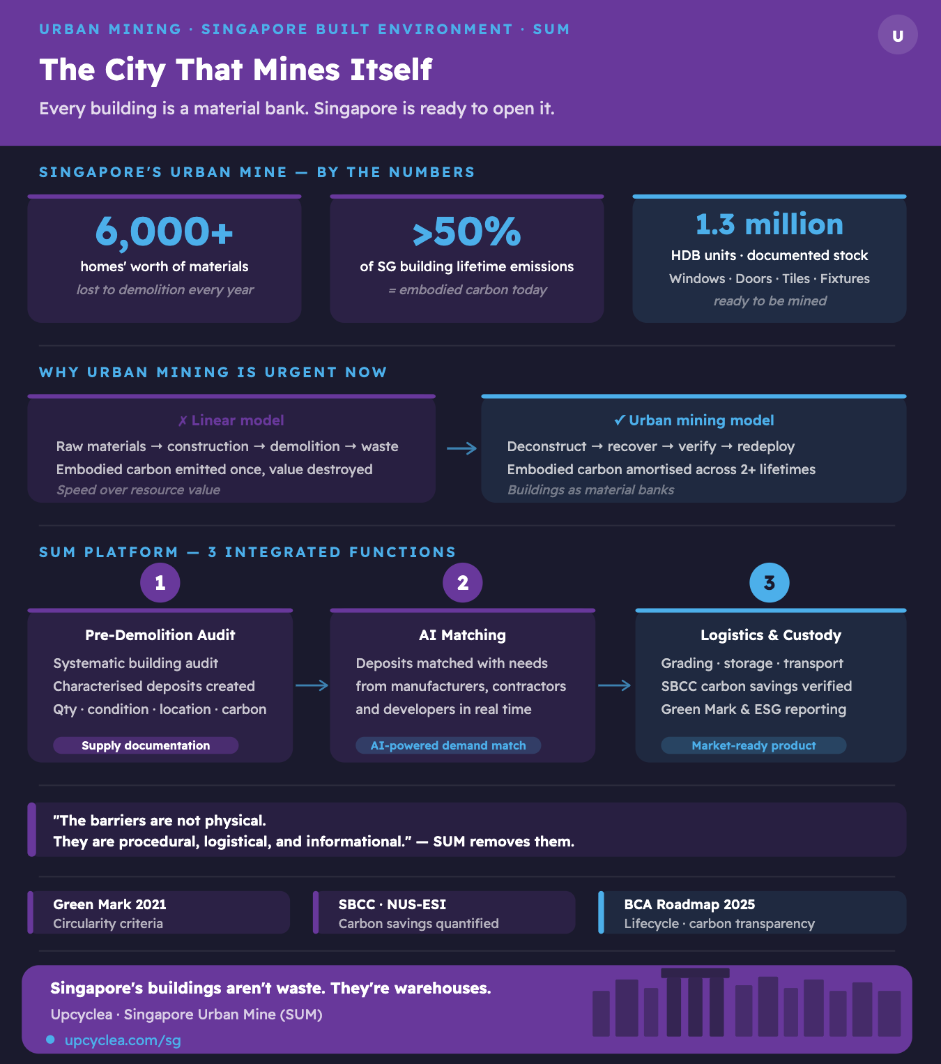 Singapore is the ideal environment for this transition. Its land constraints, its high construction intensity, its sophisticated regulatory apparatus, and its culture of systemic problem-solving create the conditions for urban mining to move from academic concept to mainstream practice. Upcyclea built SUM because the city was ready for it — and because the climate cannot wait for a slower transition.