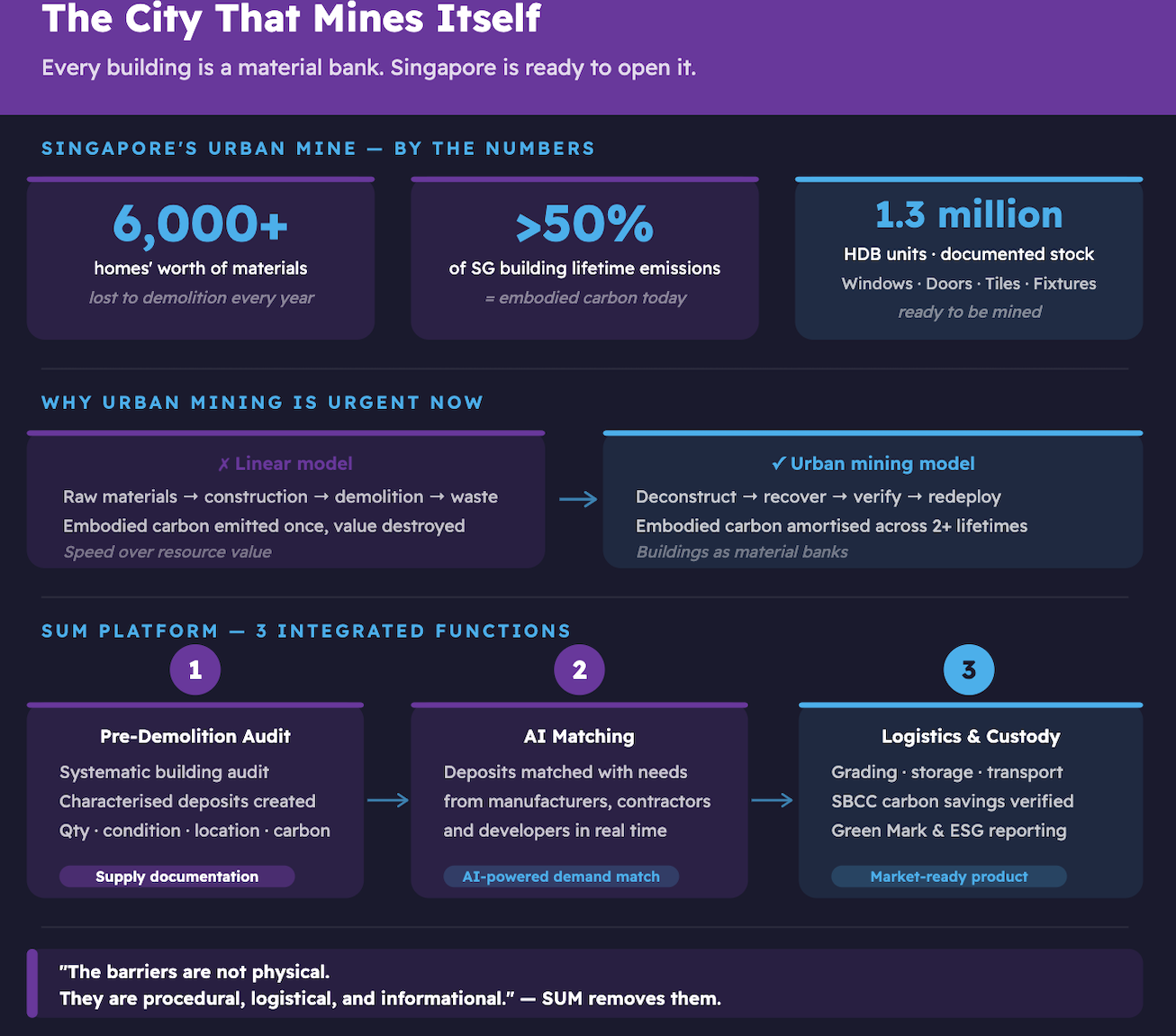 Digitise building Pre-Demolition Audits in collaboration with Singapore stakeholders to create full transparency on available materials and products.